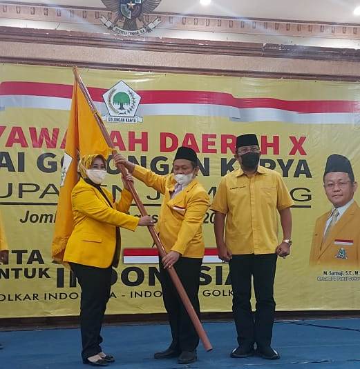Terpilih Ketua Umum DPD Golkar Kabupaten Jombang Ir Caturina Yuli Astuti Menerima Bendera Pataka Golkar Dari Ketua DPD Golkar Provinsi Jawa Timur, M Sarmuji, SE., M.Si Didampingi Sekprov DPD Golka Sahat Simanjuntak, Rabu (12/8).
