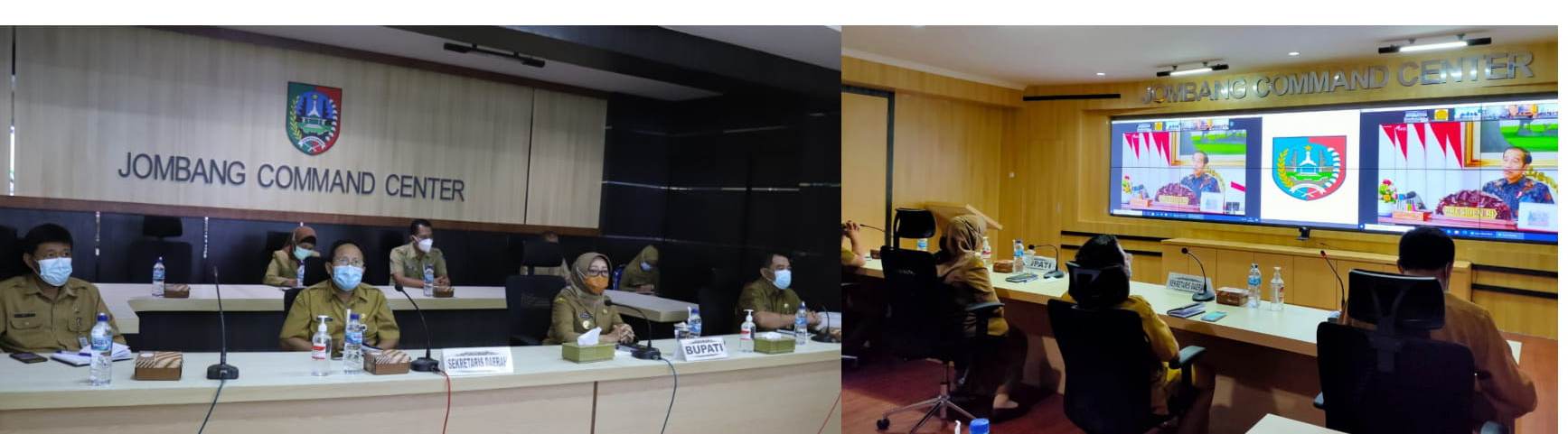 Bupati Jombang Didampingi Sekdakab dan Sejumlah Kepala Dinas OPD Mengikuti Rakernas Pertanian Secara Virtual dari Ruang JCC Pemkab Jombang, Senin (11/01/2021).