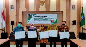 Jombang, layang.co – Bertempat di ruang rapat Swagata Pendopo Pemkab Jombang, Kamis (29/4/2021) pagi, Bupati Jombang Hj. Mundjidah Wahab, Ketua Pengadilan Agama Kabupaten Jombang Siti Hanifah, S.Ag, M.H., Plt Kepala Kementerian Agama Leksono, Kepala Dinas Kependudukan dan Pencatatan Sipil Kabupaten Jombang Drs. Masduki Zakaria, M.Si, melakukan Penandatanganan Nota Kesepahaman (MoU) untuk bersinergi dalam Pemanfaatan Data.