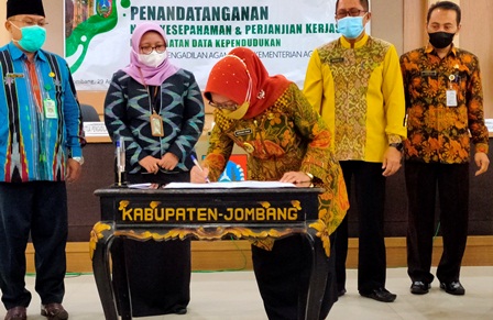 Penandatanganan Nota Kesepahaman antara Pemerintah Kabupaten Jombang dengan Pengadilan Agama tentang Kerjasama Pelaksanaan Integrasi Database Dinas Kependudukan dan Pencatatan Sipil Database Pengadilan Agama. Ditandatangani oleh Bupati Jombang Hj. Mundjidah Wahab dengan Ketua Pengadilan Agama Siti Hanifah, S.Ag, M.H.