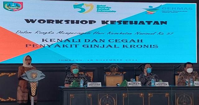 Hal tersebut disampaikan dr Agatha pada saat Workshop Gangguan Ginjal Kronik (GGK) di Pendopo Kabupaten Jombang, Kamis (18/11/2021), dalam rangka memperingati Hari Kesehatan Nasional (HKN) ke-57 tahun 2021 yang dilaksanakan Dinas Kesehatan Kabupaten Jombang.