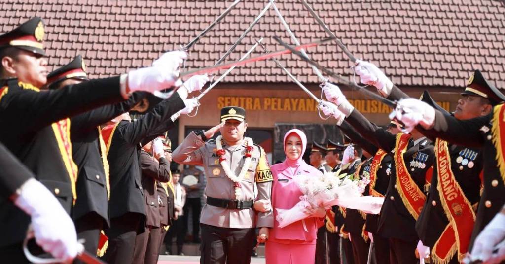 AKBP Ardi Kurniawan, S.H., S.I.K., CPHR mendapat sambutan dengan cara upacara pedangpora dari jajaran Polres Jombang.