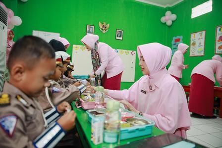 “YKB Daerah Jawa Timur berkomitmen turut mensukseskan program pemerintah yaitu pemberian makan bergizi gratis melalui asupan gizi yang sehat dan seimbang,” ujar Ny. Vitha Royce saat berbagi makanan bergizi di TK Kemala Bhayangkari 88 Jombang.