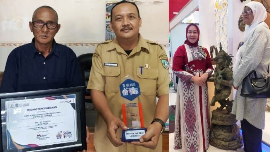 Photo kiri: Pemilik PT Adiputra, Adi Purwanto (67)/kiri menerima piagam penghargaan bersama Syamsul Ma Arif, ST. ( Plt. Kabid Pengembangan dan Distribusi) mewakili Kepala Dinas Perdagangan dan Industri, Drs. Suwignyo, M.M menyampaikan rasa terima kasih kepada Pemerintah Kabupaten Jombang atas dukungan yang selama ini diberikan. Photo kanan, Ketua Deskranasda Kabupaten Jombang Ibu Warsubi mengapit salah satu produk kuningan.